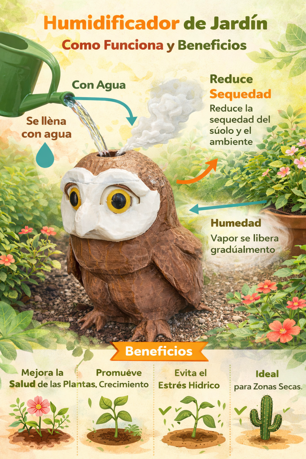 No es un accesorio plástico aburrido. Es un búho decorativo hecho artesanalmente que embellece tus macetas mientras cuida tus plantas. Perfecto para: